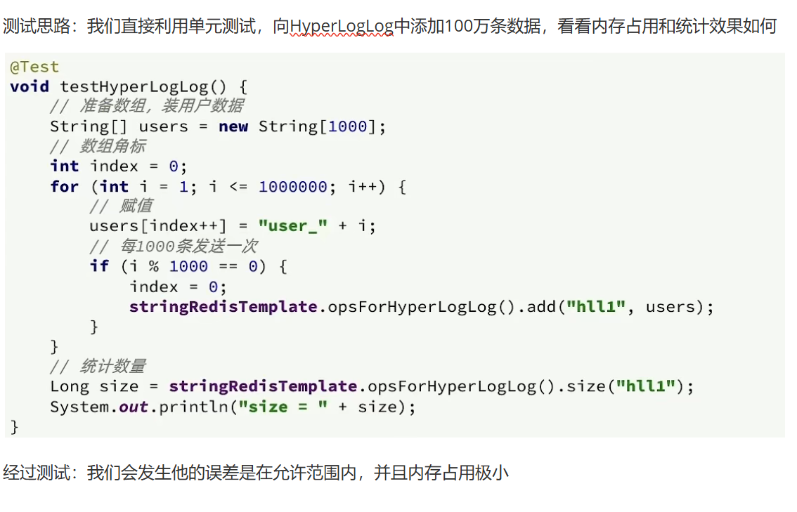 Hyperloglog(HLL)是从Loglog算法派生的概率算法,用于确定非常大的集合的基数,而不需要存储其所有值。相关算法原理大家可以参考:https://juejin.cn/post/6844903785744056333#heading-0 Redis中的HLL是基于string结构实现的,单个HLL的内存永远小于16kb,内存占用低的令人发指!作为代价,其测量结果是概率性的,有小于0.81%的误差。不过对于UV统计来说,这完全可以忽略