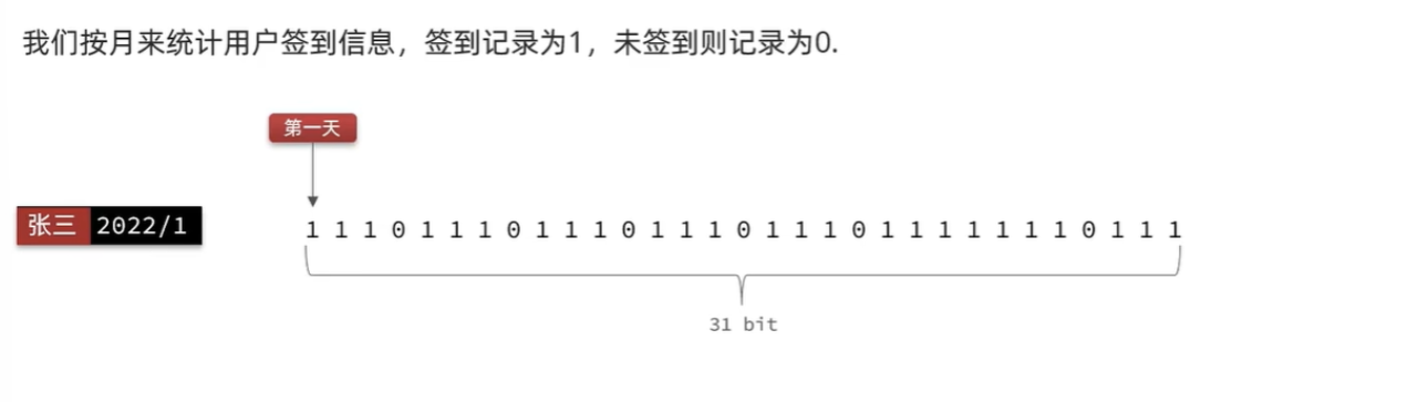 使用年月作为 Bitmap 的键,将签到信息存储在 Bitmap 中。每次签到时,将对应位置的值从 0 改为 1,表示该天已签到;若值为 0,则表示未签到。