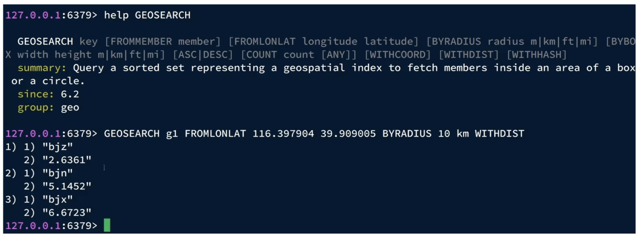 | GEOSEARCH | 在指定范围内搜索member,并按照与指定点之间的距离排序后返回。范围可以是圆形或矩形。6.2.新功能 |