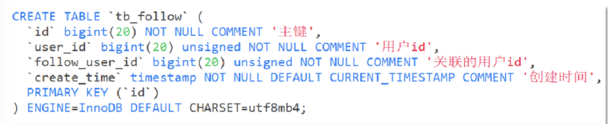 关注是User之间的关系,是博主与粉丝的关系,数据库中有一张tb_follow表来标示: