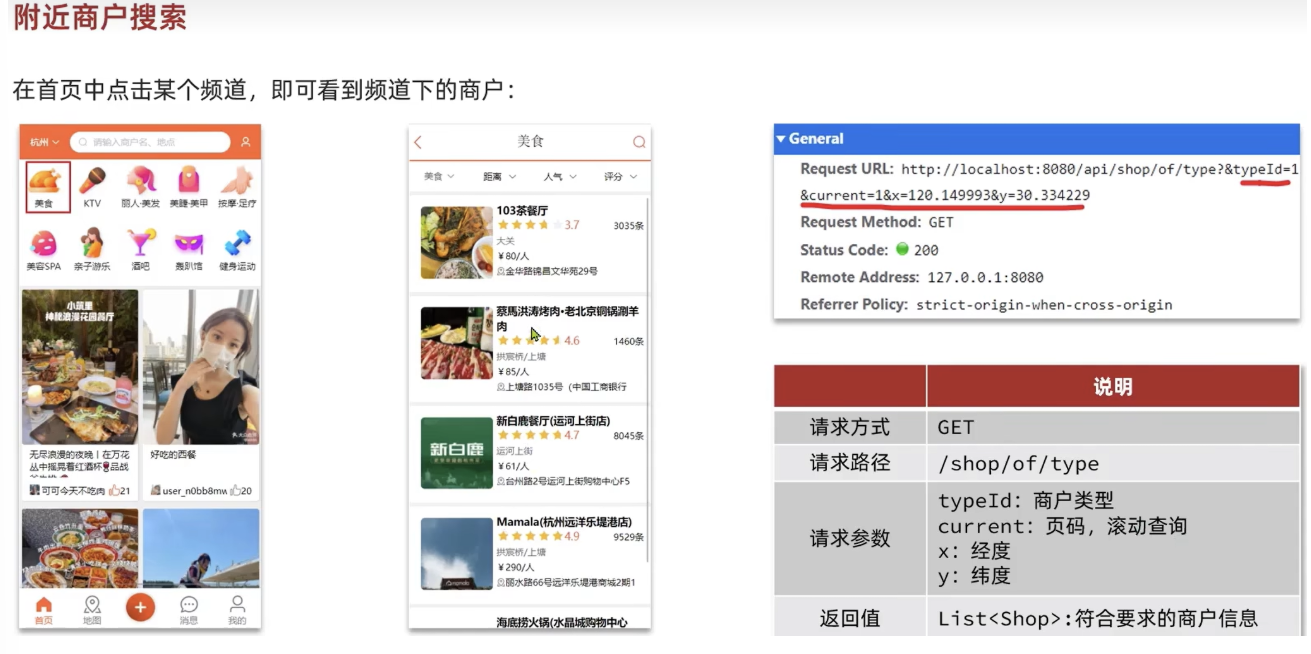 当我们点击美食之后,会出现一系列的商家,商家中可以按照多种排序方式,我们此时关注的是距离,这个地方就需要使用到我们的GEO,向后台传入当前app收集的地址(我们此处是写死的) ,以当前坐标作为圆心,同时绑定相同的店家类型type,以及分页信息,把这几个条件传入后台,后台查询出对应的数据再返回。