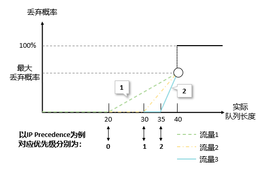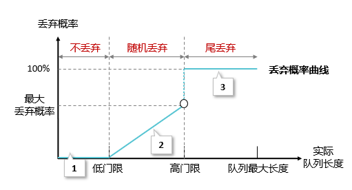 随机丢弃,设置低门限和高门限,当队列长度小于低门限不会丢弃报文,当高于低门限而低于高门限时,丢弃概率开始上升,并随着队列变成而概率上升,当到达最大丢弃概率,即大于等于高门限时,采用尾丢弃