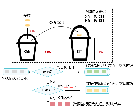 初始情况下Tc=CBS,Te=EBS,信令会以CIR的速率灌入C桶,当C桶信令灌满时,信令溢出到E桶,当流量大小<=Tc时,流量标记为绿色,并在C桶取出对应大小的信令,当流量大小>Tc但<=Te时,流量将被染上黄色,并从E桶拿出对应大小的信令,当流量大小>Te时,流量被染为红色,桶容量不变