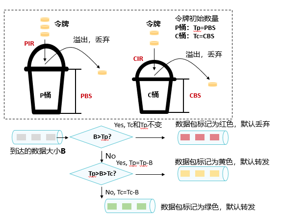 初始情况下,Tp=PBS,Tc=CBS,每个桶之间没有信令交流,桶满则丢弃多余信令,通常情况下PBS>CBS,PIR>CIR,当流量大小小于Tc时,标记为绿色,并从两个桶中取走对应大小的信令,当流量大小大于Tc但小于等于Tp时,标记为黄色,从P桶取走对应大小的信令,如果流量大小大于Tp标记红色,不拿取两个桶的任何信令