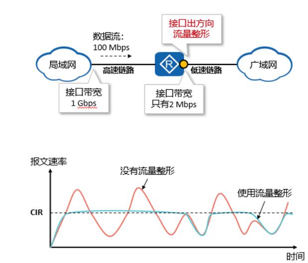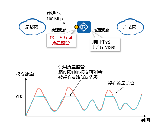 该配置可以通过MQC用或者直接通过基于接口的流量监管实现,一般在接口入方向进行调用,高速进入低速,丢弃超限流量或者降低优先级,不需要额外内存缓存资源,不会带来抖动延迟,丢包可能触发重传,可触发重标记