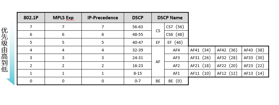 DSCP实际使用尾数6bit,取值0-63,用于标识流量优先级具体看下表
