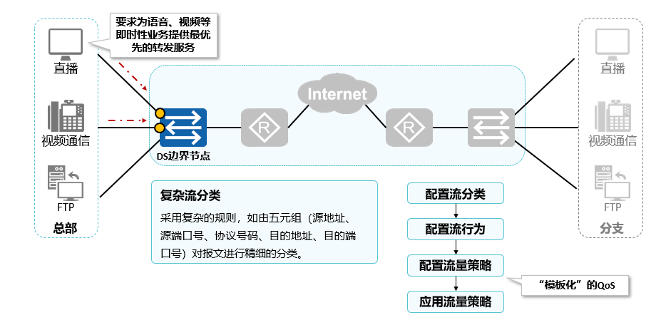 简单流分类仅仅能区分流量大类对于业务较多且类型重叠的流量而言,简单流分类无法很好缓解流量拥塞问题,于是可以根据五元组对相关流量进行匹配和优化管理,一般是在DS边界使用,通过MQC给对应流量打上优先级再将优先级传递给其他DS节点进行简单流分类