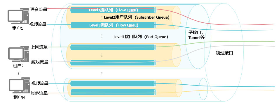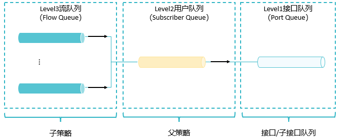 解决多租户问题实现,HQoS基于队列实现层次化调度,支持三级队列:Level3流队列(Flow Queue)、Level2用户队列(Subscriber Queue)、Level1接口队列(Port Queue)