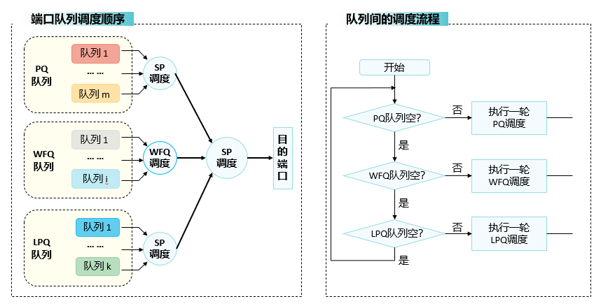 PQ>WFQ>LPQ,优先保障PQ队列的带宽,再把剩余流量交个各WFQ队列划分,最后还有剩余带宽分配给LPQ