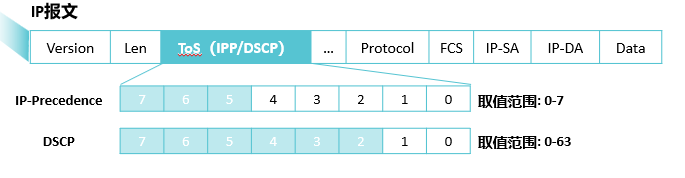 IP报文中的ToS字段拆分为IP-Precedence,改作用类似802.1p,用于区分标识流量是语音流量或者视频等流量,其共计8种流量类型