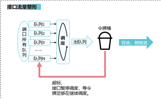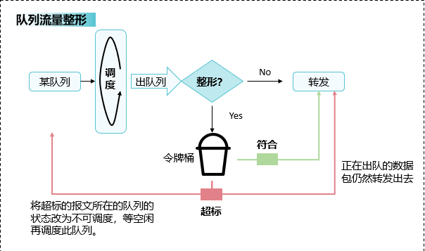 通过令牌桶算法和缓冲区实现,其令牌桶仅仅采用单速单桶,绿色发送,红色将报文加入相关队列,并改队列设置为不可调度,等待信令填充或满足条件后才能再次调度,如果队列被占满,则丢弃相关报文