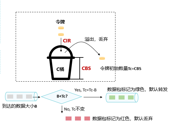 初始情况下,Tc(桶的当前信令容量)=CBS,并且以CIR的速率向桶内灌输信令,当桶满时,信令将溢出丢弃不会超出CBS,在单速单桶中,令牌仅仅回出先两种颜色,其分别为红色和绿色,缺省情况下,流量大小大于等于Tc(桶的当前信令容量)会标记为绿色,并从桶内取走对应大小的信令,如果大于则会将流量标记为红色,Tc容量不变