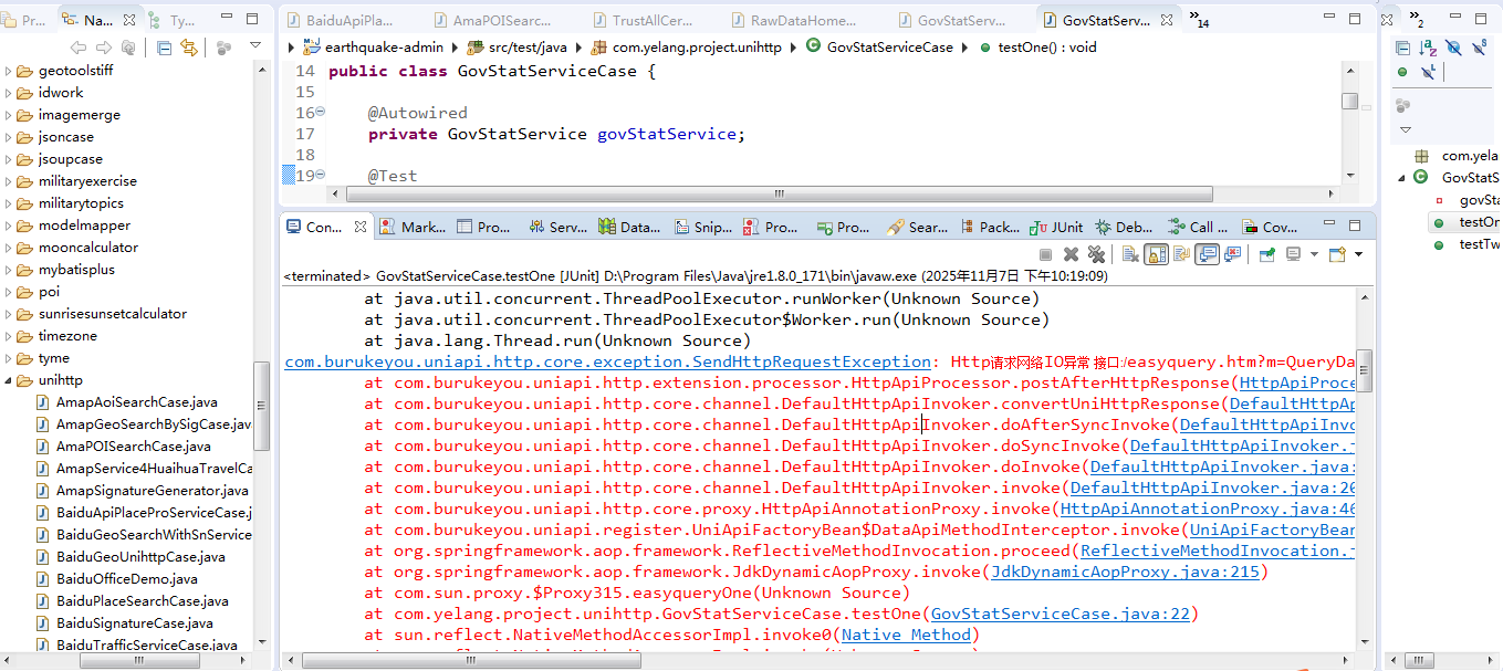 public class GovStatServiceCase {@Autowiredprivate GovStatService govStatService;@Testpublic void testOne() {try {HttpResponse<String> result = govStatService.easyqueryOne();System.out.println(result.getBodyResult());} catch (Exception e) {e.printStackTrace();}}@Testpublic void testTwo() {String m = "QueryData";String dbcode = "fsyd"; String rowcode = "zb";String colcode = "sj";String wds = "[{\"wdcode\":\"reg\",\"valuecode\":\"110000\"}]";String dfwds = "[{\"wdcode\":\"zb\",\"valuecode\":\"A030102\"}]";String k1 = "1692174996701";String h = "1";HttpResponse<String> result = govStatService.easyQueryTwo(m, dbcode, rowcode, colcode, wds, dfwds, k1, h);System.out.println(result);System.out.println(result.getBodyResult());}