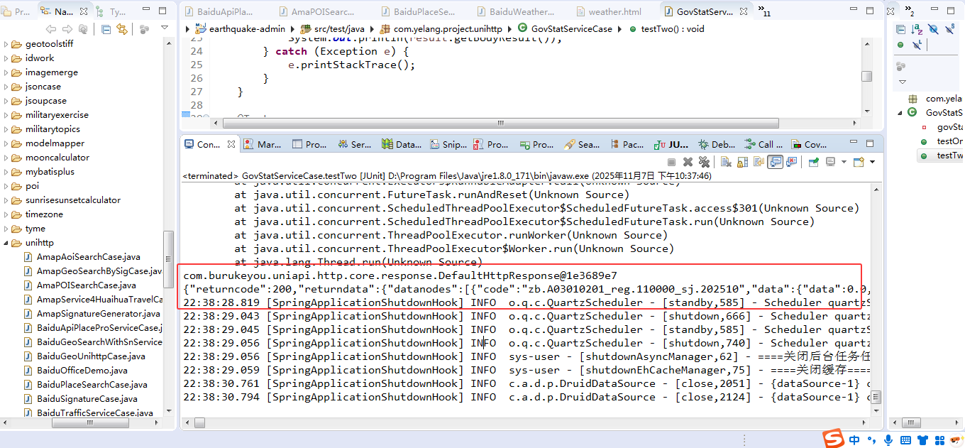 然后在Junit组件中来调用这个接口,并且调用官网的服务接口,核心代码如下: