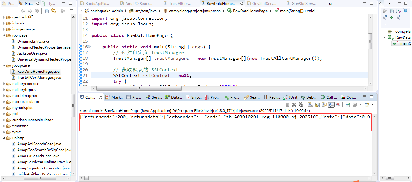 public class RawDataHomePage {public static void main(String[] args) {// 创建自定义 TrustManagerTrustManager[] trustManagers = new TrustManager[]{new TrustAllCertManager()};// 获取默认的 SSLContextSSLContext sslContext = null;try {sslContext = SSLContext.getInstance("SSL");sslContext.init(null, trustManagers, new java.security.SecureRandom());} catch (NoSuchAlgorithmException | KeyManagementException e) {e.printStackTrace();}// 应用自定义的 SSLContextHttpsURLConnection.setDefaultSSLSocketFactory(sslContext.getSocketFactory());try {Connection.Response response = Jsoup.connect("http://data.stats.gov.cn/easyquery.htm?m=QueryData&dbcode=fsyd&rowcode=zb&colcode=sj&wds=%5B%7B%22wdcode%22%3A%22reg%22%2C%22valuecode%22%3A%22110000%22%7D%5D&dfwds=%5B%7B%22wdcode%22%3A%22zb%22%2C%22valuecode%22%3A%22A030102%22%7D%5D&k1=1692174996701&h=1").userAgent("Mozilla/5.0 (Windows NT 10.0; Win64; x64) AppleWebKit/537.36 (KHTML, like Gecko) Chrome/111.0.0.0 Safari/537.36 Edg/111.0.1661.54").ignoreContentType(true).execute();String body = response.body();System.out.println(body);} catch (IOException e) {e.printStackTrace();}}