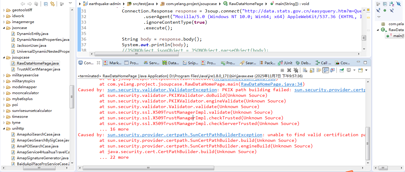 以上代码编写完成后,运行程序后,遇到以上问题怎么解决呢?如果大家有验证证书的话,可以直接在Jsoup中带上验证证书即可,这样也不会出现问题。如果我们什么都没有,却因为项目需要,也需要接入数据,那么如何解决呢?