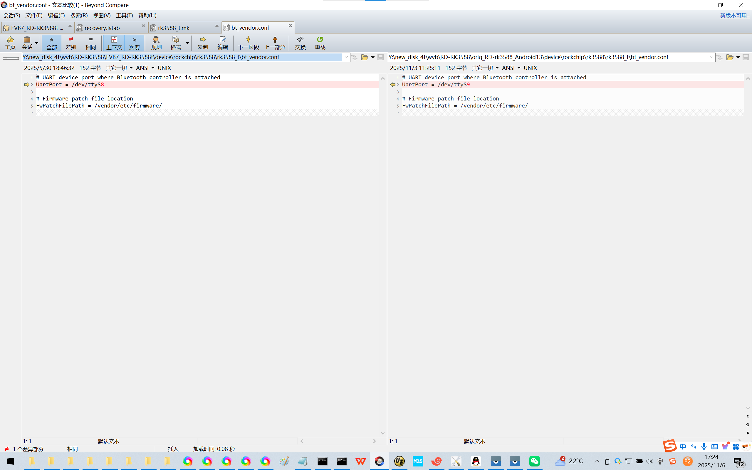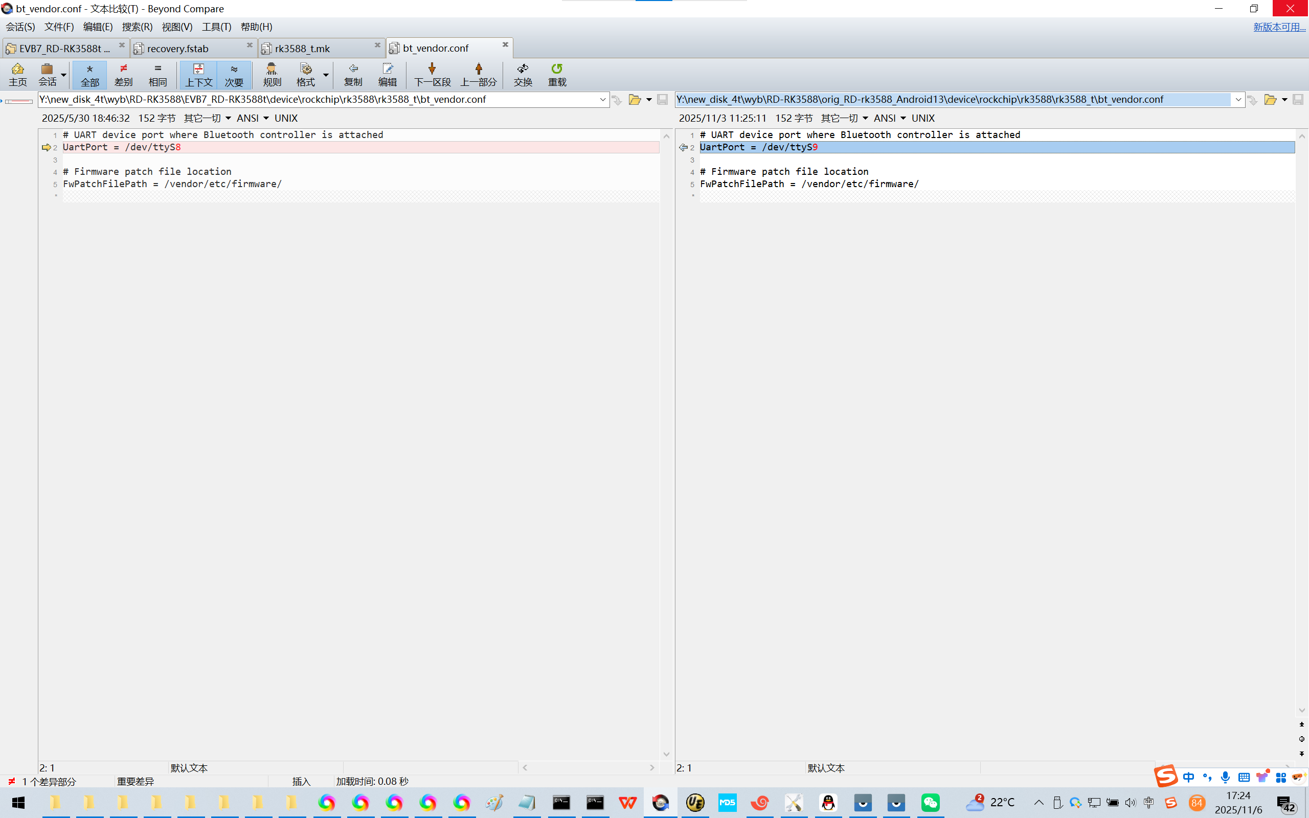 将Rockchip的原厂Android13系统SDK和荣品的SDK进行比对,很容易/根据经验/艰难得知UART串口号错了。