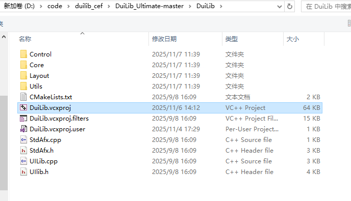 取好项目名,因为我们需要把duilib的头文件添加到项目里面,为了方便我们直接把duilib整个项目都拷贝到新项目的文件夹中。