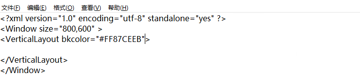 最后一步就是要创建frame.xml文件了,这是最基本的xml代码,创建800*600以天蓝色为背景的窗口。记得保存到skin文件夹中。