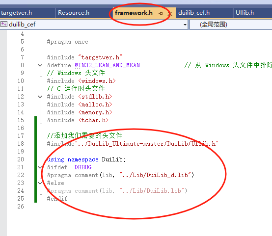 然后在生产的项目把duilib头文件Include进去,比如我在framework.h这个文件中,你也可以在自己项目的预编译头文件写。