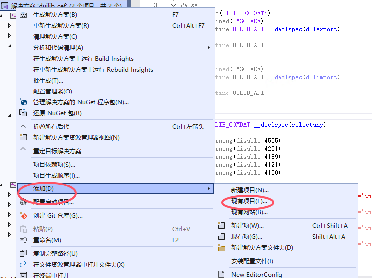 然后右键解决方案,添加-->现有项目-->选择解决方案路径-->DuiLib.vcxproj