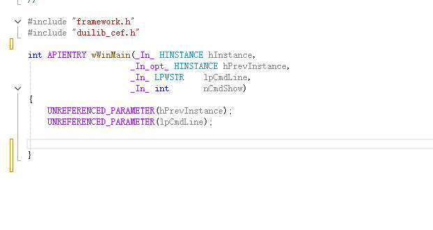 {UNREFERENCED_PARAMETER(hPrevInstance);UNREFERENCED_PARAMETER(lpCmdLine);CPaintManagerUI::SetInstance(hInstance);CPaintManagerUI::SetResourcePath(CPaintManagerUI::GetInstancePath() + _T("skin"));CFrameWnd duiFrame(L"frame.xml");duiFrame.Create(NULL, _T("FrameWnd"), UI_WNDSTYLE_DIALOG | WS_MINIMIZEBOX, WS_EX_WINDOWEDGE);duiFrame.ShowModal();