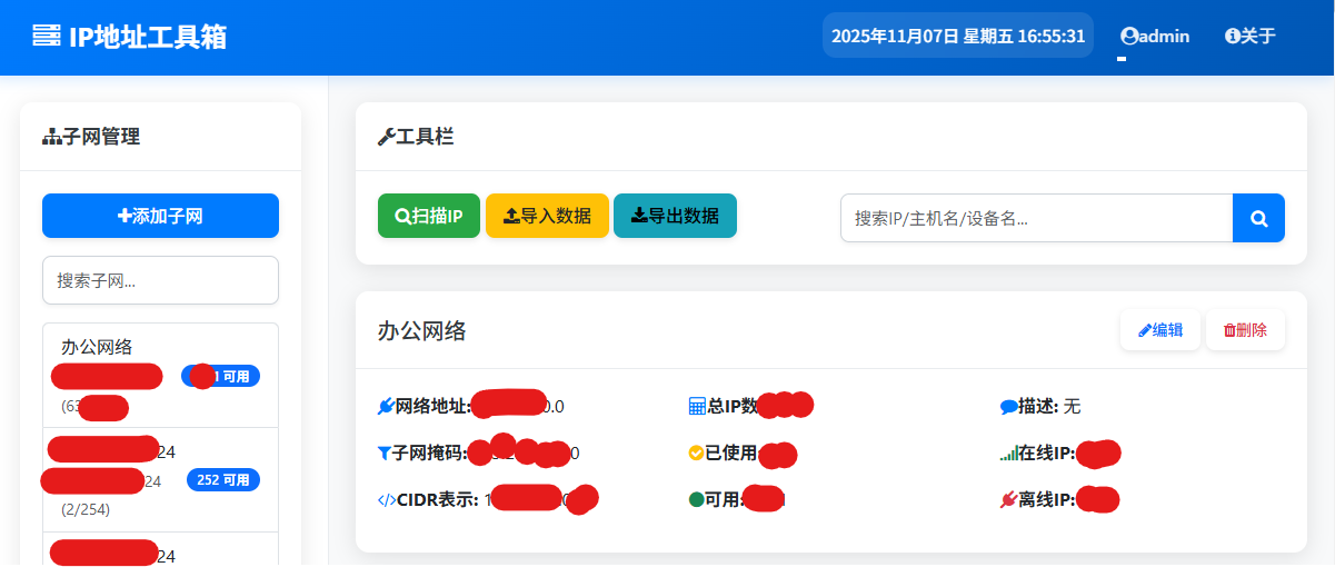 IP地址管理是网络运维的重要组成部分,尤其在大型网络环境中,需要清晰了解IP地址的使用情况,包括已分配、空闲、冲突等状态,以便进行有效的资源管理和问题排查。本项目旨在开发一个直观、高效的IP地址工具箱,帮助网络管理员更好地管理IP地址资源。