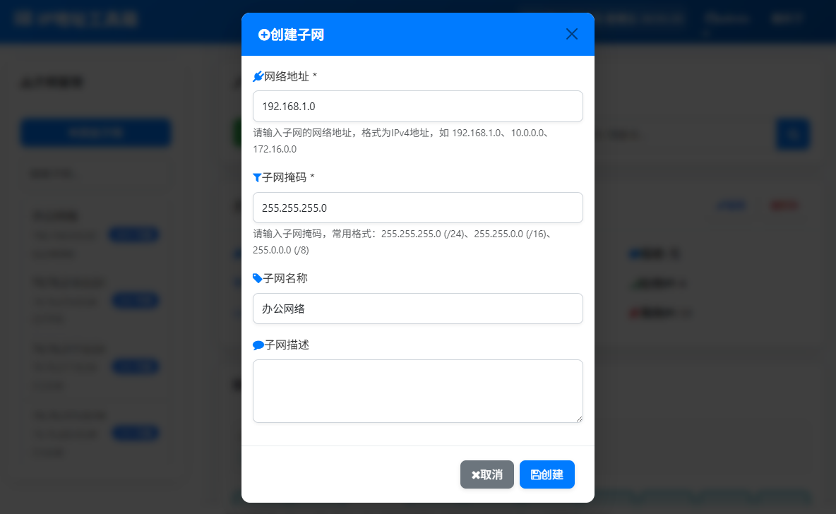 - Response: `{id, network_address, subnet_mask, cidr, name, description, ip_count, used_count, available_count}`