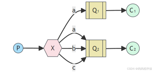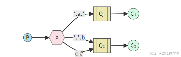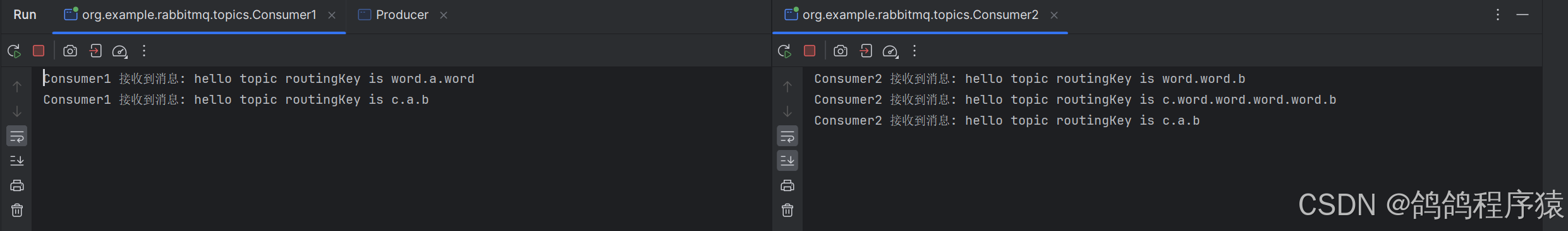 import java.util.concurrent.TimeoutException;public class Producer {public static void main(String[] args) throws IOException, TimeoutException {//1. 创建连接ConnectionFactory connectionFactory = new ConnectionFactory();connectionFactory.setHost("101.43.47.137");//ip地址connectionFactory.setPort(5672);//默认端口号connectionFactory.setUsername("study");//用户connectionFactory.setPassword("study");//用户密码connectionFactory.setVirtualHost("study");//虚拟主机Connection connection = connectionFactory.newConnection();//2. 创建信道Channel channel = connection.createChannel();//3. 声明交换机channel.exchangeDeclare("topic.exchange", BuiltinExchangeType.TOPIC,true);//4. 声明队列channel.queueDeclare("topic.queue1",true,false,false,null);channel.queueDeclare("topic.queue2",true,false,false,null);//5. 队列与交换机绑定channel.queueBind("topic.queue1","topic.exchange","*.a.*");channel.queueBind("topic.queue2","topic.exchange","*.*.b");channel.queueBind("topic.queue2","topic.exchange","c.#");//6. 生产消息String msgA = "hello topic routingKey is word.a.word";channel.basicPublish("topic.exchange","word.a.word",null,msgA.getBytes());String msgB = "hello topic routingKey is word.word.b";channel.basicPublish("topic.exchange","word.word.b",null,msgB.getBytes());String msgC = "hello topic routingKey is c.word.word.word.word.b";channel.basicPublish("topic.exchange","c.word.word.word.word.b",null,msgC.getBytes());String msgD = "hello topic routingKey is c.a.b";channel.basicPublish("topic.exchange","c.a.b",null,msgD.getBytes());System.out.println("发送消息成功");//7. 释放资源channel.close();connection.close();}
