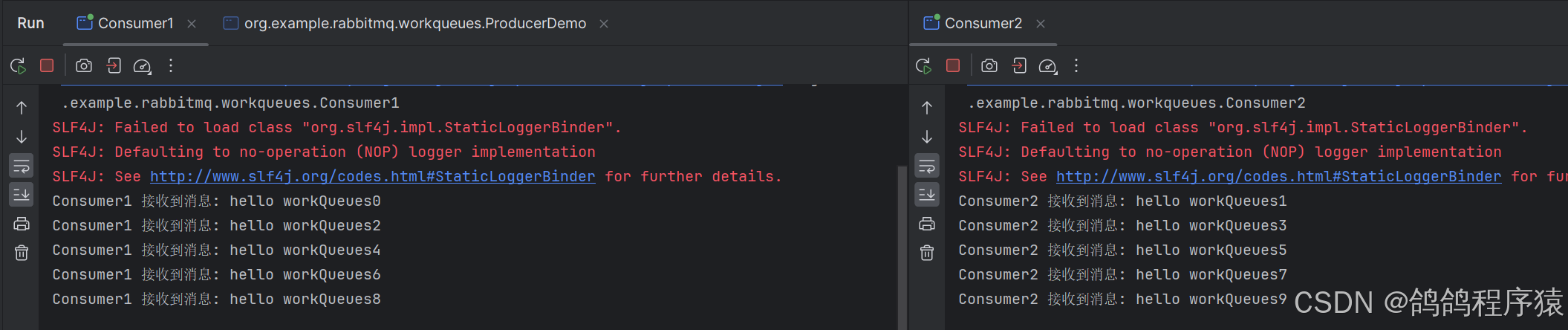 import java.util.concurrent.TimeoutException;public class Consumer1 {public static void main(String[] args) throws IOException, TimeoutException, InterruptedException {//建立连接ConnectionFactory connectionFactory = new ConnectionFactory();connectionFactory.setHost("101.43.47.137");//ip地址connectionFactory.setPort(5672);//默认端口号connectionFactory.setUsername("study");//用户connectionFactory.setPassword("study");//用户密码connectionFactory.setVirtualHost("study");//虚拟主机Connection connection = connectionFactory.newConnection();//创建信道Channel channel = connection.createChannel();//声明队列channel.queueDeclare("workQueues",false,false,true,null);//消费消息DefaultConsumer consumer = new DefaultConsumer(channel) {@Overridepublic void handleDelivery(String consumerTag, Envelope envelope, AMQP.BasicProperties properties, byte[] body) throws IOException {System.out.println("Consumer1 接收到消息: " + new String(body));}};channel.basicConsume("workQueues",true,consumer);Thread.sleep(100);////释放资源//channel.close();//connection.close();}}