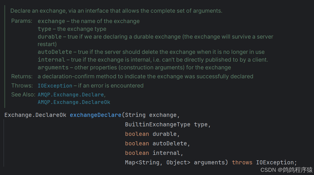 声明交换机的方法是Channel类下的exchangeDeclare方法