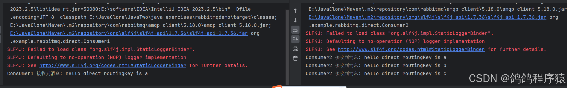 import java.util.concurrent.TimeoutException;public class Producer {public static void main(String[] args) throws IOException, TimeoutException {//1. 创建连接ConnectionFactory connectionFactory = new ConnectionFactory();connectionFactory.setHost("101.43.47.137");//ip地址connectionFactory.setPort(5672);//默认端口号connectionFactory.setUsername("study");//用户connectionFactory.setPassword("study");//用户密码connectionFactory.setVirtualHost("study");//虚拟主机Connection connection = connectionFactory.newConnection();//2. 创建信道Channel channel = connection.createChannel();//3. 声明交换机channel.exchangeDeclare("direct.exchange", BuiltinExchangeType.DIRECT,true);//4. 声明队列channel.queueDeclare("direct.queue1",true,false,false,null);channel.queueDeclare("direct.queue2",true,false,false,null);//5. 队列与交换机绑定channel.queueBind("direct.queue1","direct.exchange","a");channel.queueBind("direct.queue2","direct.exchange","a");channel.queueBind("direct.queue2","direct.exchange","b");channel.queueBind("direct.queue2","direct.exchange","c");//6. 生产消息String msgA = "hello direct routingKey is a";channel.basicPublish("direct.exchange","a",null,msgA.getBytes());String msgB = "hello direct routingKey is b";channel.basicPublish("direct.exchange","b",null,msgB.getBytes());String msgC = "hello direct routingKey is c";channel.basicPublish("direct.exchange","c",null,msgC.getBytes());System.out.println("发送消息成功");//7. 释放资源channel.close();connection.close();}