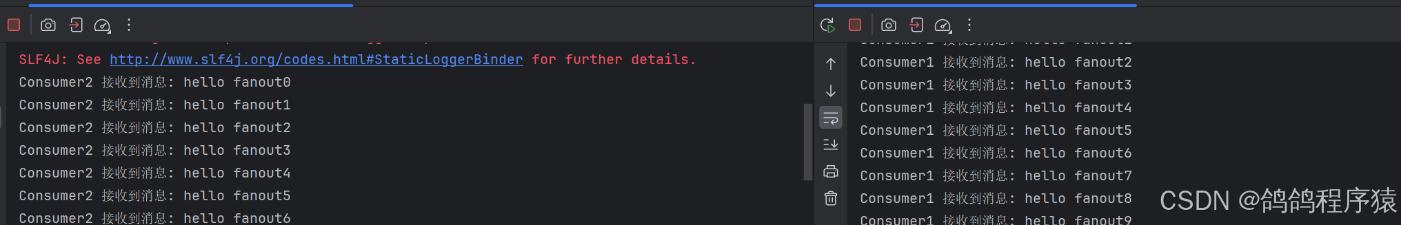 import java.util.concurrent.TimeoutException;public class Producer {public static void main(String[] args) throws IOException, TimeoutException {//1. 创建连接ConnectionFactory connectionFactory = new ConnectionFactory();connectionFactory.setHost("101.43.47.137");//ip地址connectionFactory.setPort(5672);//默认端口号connectionFactory.setUsername("study");//用户connectionFactory.setPassword("study");//用户密码connectionFactory.setVirtualHost("study");//虚拟主机Connection connection = connectionFactory.newConnection();//2. 创建信道Channel channel = connection.createChannel();//3. 声明交换机channel.exchangeDeclare("fanout.exchange", BuiltinExchangeType.FANOUT,false);//4. 声明队列channel.queueDeclare("fanout.queue1",true,false,false,null);channel.queueDeclare("fanout.queue2",true,false,false,null);//5.交换机与队列绑定channel.queueBind("fanout.queue1","fanout.exchange","");channel.queueBind("fanout.queue2","fanout.exchange","");//6. 生产消息for(int i = 0; i < 10; i++) {String msg = "hello fanout"+i;channel.basicPublish("fanout.exchange","",null,msg.getBytes());}System.out.println("发送消息成功");//7. 释放资源channel.close();connection.close();}