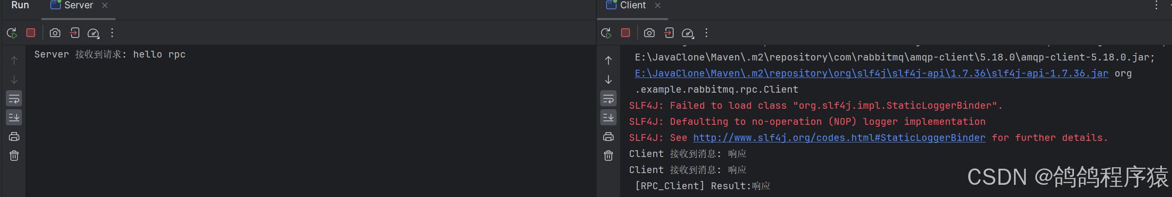 import java.util.concurrent.TimeoutException;public class Client {public static void main(String[] args) throws IOException, TimeoutException, InterruptedException {//1. 创建连接ConnectionFactory connectionFactory = new ConnectionFactory();connectionFactory.setHost("101.43.47.137");//ip地址connectionFactory.setPort(5672);//默认端口号connectionFactory.setUsername("study");//用户connectionFactory.setPassword("study");//用户密码connectionFactory.setVirtualHost("study");//虚拟主机Connection connection = connectionFactory.newConnection();//2. 创建信道Channel channel = connection.createChannel();//3. 声明队列channel.queueDeclare("rpc.request.queue",true,false,false,null);channel.queueDeclare("rpc.response.queue",true,false,false,null);//4. 发送消息//设置请求标识String correlationId = UUID.randomUUID().toString();AMQP.BasicProperties properties = new AMQP.BasicProperties().builder().correlationId(correlationId).replyTo("rpc.response.queue").build();String msg = "hello rpc";channel.basicPublish("","rpc.request.queue", properties,msg.getBytes());//5. 接收响应//使用阻塞队列存储响应final BlockingQueue<String> response = new ArrayBlockingQueue<>(1);DefaultConsumer consumer = new DefaultConsumer(channel) {@Overridepublic void handleDelivery(String consumerTag, Envelope envelope, AMQP.BasicProperties properties, byte[] body) throws IOException {System.out.println("Client 接收到消息: " + new String(body));//判断唯⼀标识正确, 放到阻塞队列中if(correlationId.equals(properties.getCorrelationId())) {response.offer(new String(body));}System.out.println("Client 接收到消息: " + new String(body));}};channel.basicConsume("rpc.response.queue",true,consumer);// 获取响应的结果String result = response.take();System.out.println(" [RPC_Client] Result:" + result);}