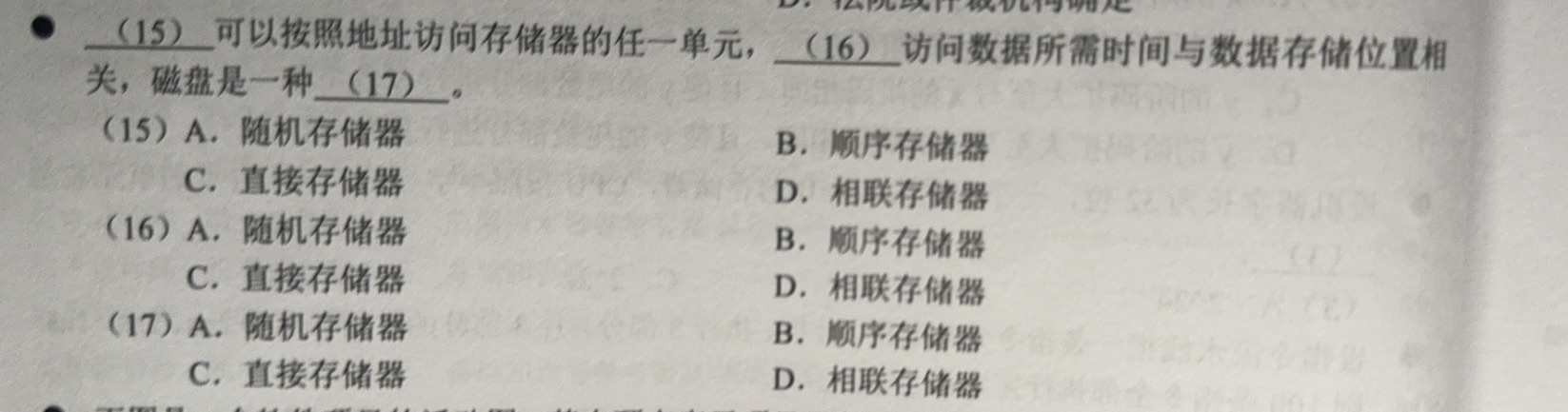 7.随机存储器可以按照地址访问存储器的任一单元;相联存储器根据内容访问,类似于键值对根据键找到值,同一键可以存储在存储器的多个位置,所以将该关键字与存储器每一单元进行比较;顺序访问器按顺序查找目标地址,因此访问所需时间与存储位置相关;直接存储器是按照数据块所在位置访问,寻找块时用的随机寻址,块内用的是顺序寻址