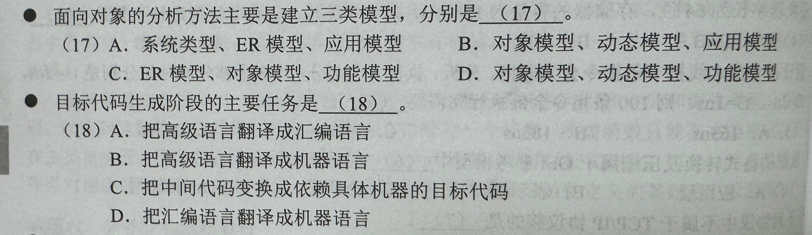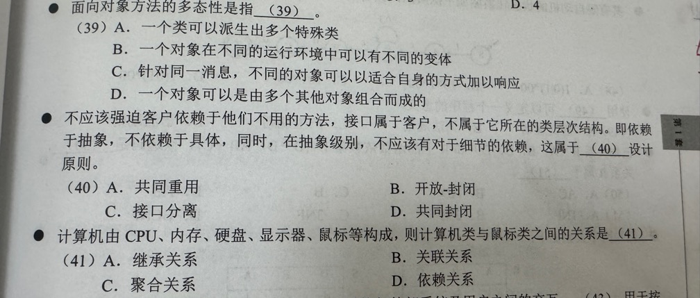 16.没有A、D这两个设计原则。开闭原则指类这种可以被拓展但不能被修改。接口分离(接口隔离)原则指用多个专用接口而不用单一总接口,可以做到客户不想要的接口不被放在接口中。