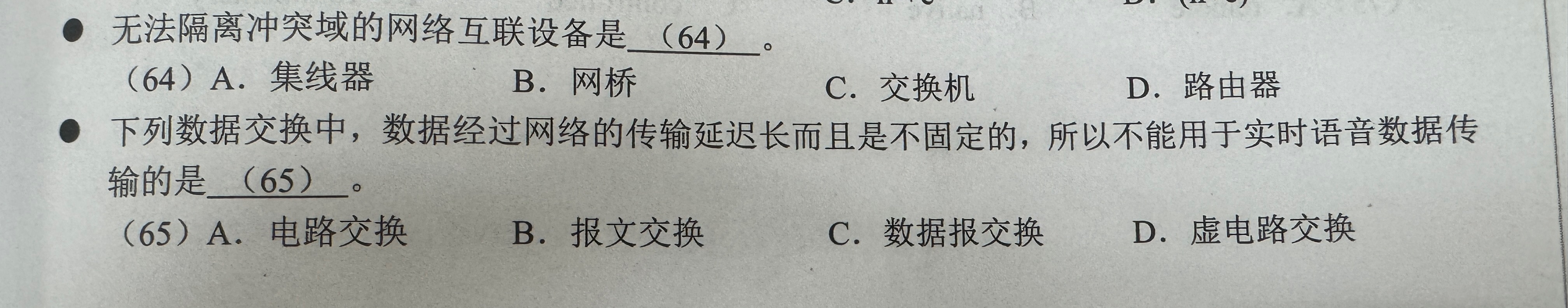 24.报文交换无需连接,因此比较不可靠,同时一个报文发送完才会发送下一个,因此时间开销比较大;分组交换基于报文交换做出了优化,可以多个报文一起传送;电路交换就类似于打电话,建立起连接以后,只能够接受限定数量的设备进行通信;虚电路交换类似于在公路上规划了一条固定的导航线路,所有设备可以共享这条公路,但所有数据包都严格按照路线行驶。