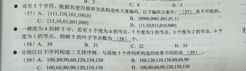 19.哈夫曼树为带权路径长度最小的二叉树。哈夫曼树由下而上构造,其节点的度只可能为 0 or 2。根据哈夫曼编码画出哈夫曼树的原则为左0右1,哈夫曼编码从根节点往叶节点来读路径长度
