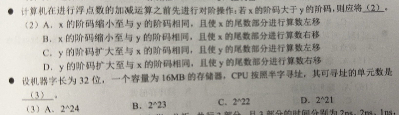 2.字长为32位bit,半字寻址即为 16位bit = 2B;因此,可以寻址的单元数为 16MB / 2B = 2^23