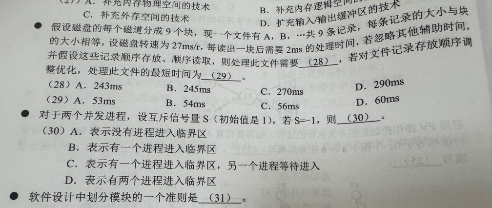 10.磁盘转速为27ms/r,意为从一个磁道的磁头到磁尾需要27ms;每个磁道顺序存放9条记录(当中没有间隙),所以读出1条记录需 27/9 = 3ms;读出后还需要处理,所以对A记录来说一共需要 3+2 = 5 ms;经过处理以后,开始准备读取B记录,发现读写头此时不在B记录的头部(处理时读写头还在往后移动),所以需要重新转一圈转到B记录的开头;转到读写头当前所在位置需要 27ms,相距B记录的首部多转了 2ms(A记录处理时间),所以转 27 - 2 = 25 ms即可;B -> C 时,27 - 2 + 3 + 2 = 27 + 3,加3为读取时间,加2为处理时间;再转一圈,回到C的开头,最后处理完C也需要 27 + 3 ms;假设文件只有 3条记录,那么总的时间为 (3+2) + 2*(27+3) ,推广到9条记录为 (3+2) + 8*(27+3) = 245ms