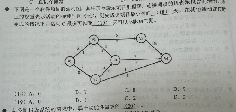 8.看到“晚多少天可以不影响工期”是在求松弛时间。关键路径需要 8 天(BED),从 V6 退回到 V2 舍去了 GC ,即 8 - 2 - 2 = 4 天,所以最多可以晚(4 - 3 = 1)天