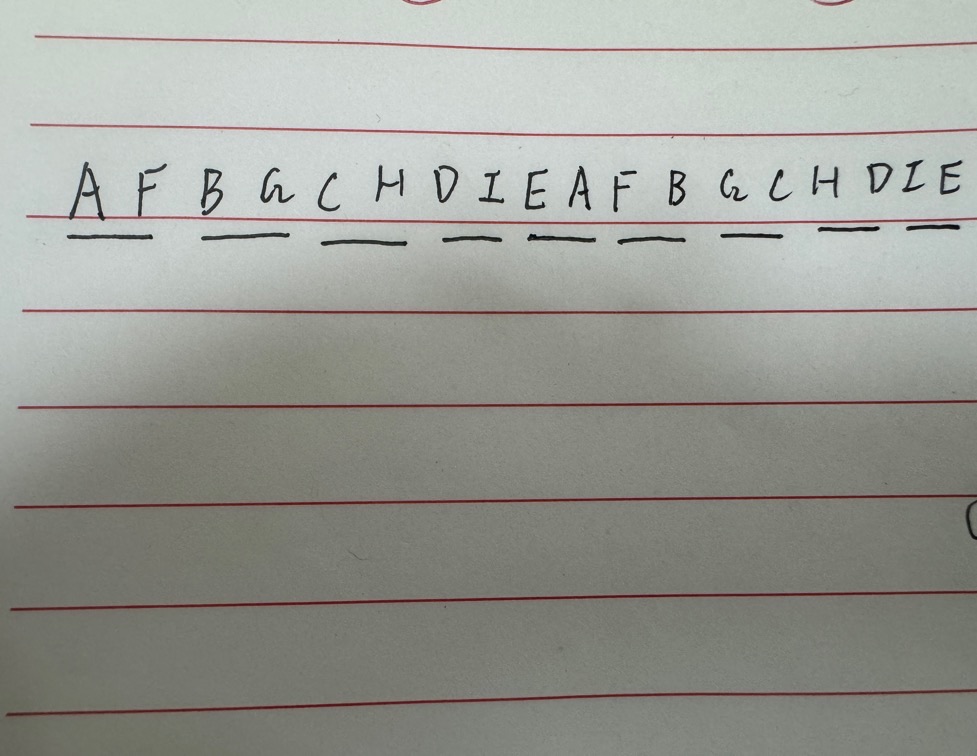 11.通过上一问,我们不难发现经过处理时间,读写头会处于第二块的中间位置。所以为了不影响读取,我们可以把要的第二条记录放在第三块的位置,并用靠后位置的记录占位,即以 AFB 的方式顺序存在磁道中。推广到整个文件记录,即为 AFBGCHDIE ,通过下图不难看出总共花费的时间为 (5+1)* 9 = 54 ms。需要注意的是,最后的 I 读取完,读写头不需要到 E 的尾部(后面没有记录需要读取了),所以 54 - 1 = 53 ms 为结果