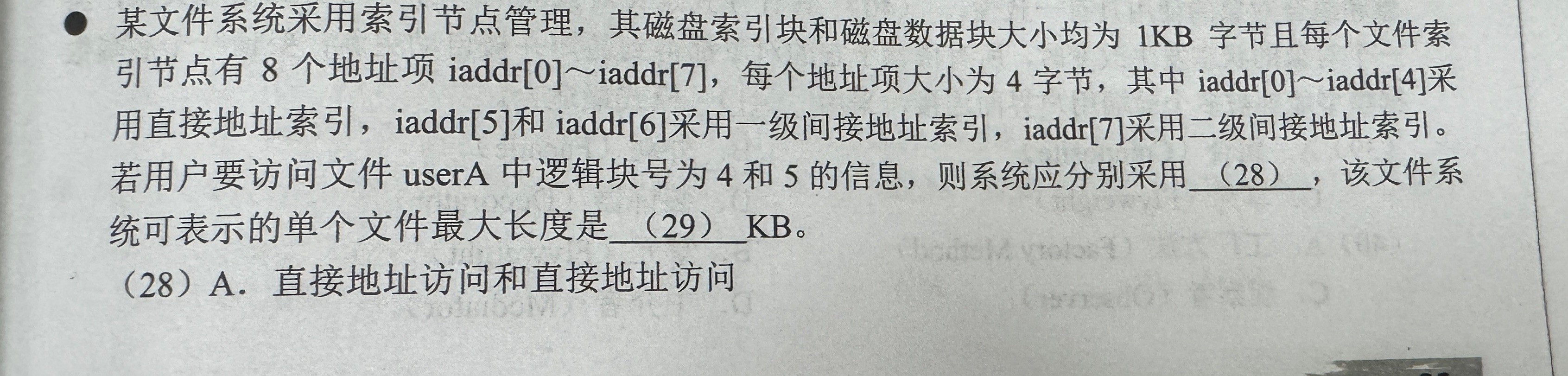 36.索引块大小为 1KB,每个地址项 4B,所以每个索引块对应了 1KB / 4B = 256 个索引地址;一级间接地址索引即1个索引节点对应了1块索引块,二级间接地址索引即1个索引节点对应了1块索引块,该索引块中的每个索引地址又对应了一块索引块;所以直接地址索引为 0~4 ,一级间接地址索引为 5~(5 + 2*256 -1 = 516),二级间接地址索引为 517~(517+256*256-1 = 66052),可表示的地址范围为 0~66052(即66053个地址),每个数据块大小为1KB,所以最大长度是 1*66053 KB