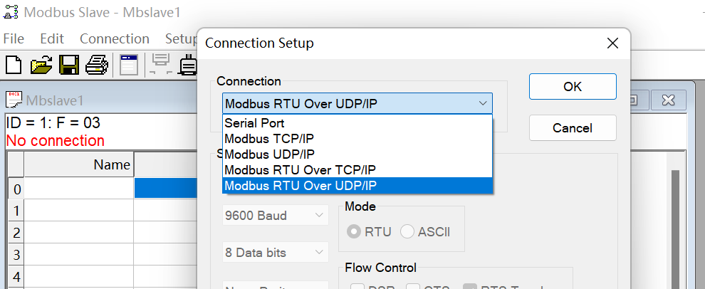 }else if (raUDP.Checked){// UDPudpClient= new UdpClient();udpClient.Connect(IPAddress.Parse(txtIP.Text), int.Parse(txtPort.Text));master = ModbusIpMaster.CreateIp(udpClient);}else if (raRUTOT.Checked){// RTU Over TCPtcpClient = new TcpClient();tcpClient.ConnectAsync(IPAddress.Parse(txtIP.Text), int.Parse(txtPort.Text));