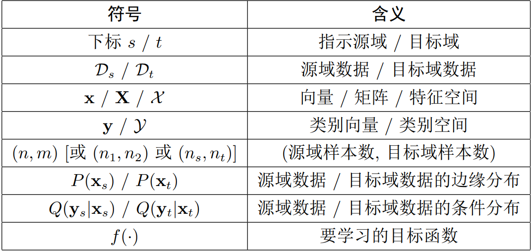 我们已经基本介绍了迁移学习中常用的符号。表1是一个符号表: