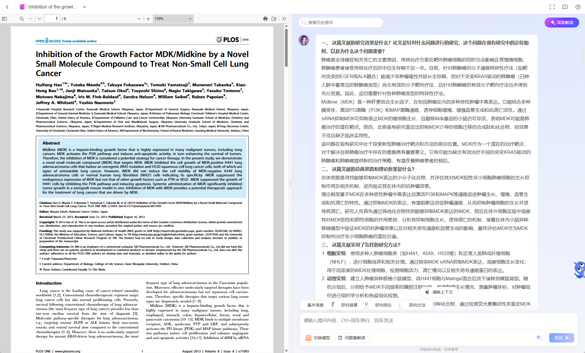 技巧:导入文献后,先看“研究背景与意义”部分,对比“核心研究内容”,科学问题往往就藏在二者的交汇处——背景描述了已知知识,核心内容则针对空白发问。汇报时,你可以直接复制这些提炼点,逻辑清晰、导师满意。