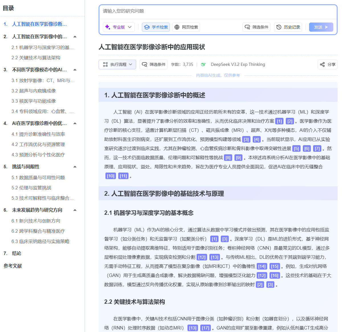 - Deep Search:输入“AI medical imaging diagnosis”,选专业版,提问“文献中核心科学问题汇总”。系统检索 20 篇相关论文,生成报告:常见问题包括“AI 模型如何减少假阳性?”和“算法泛化能力在不同设备间的挑战”。