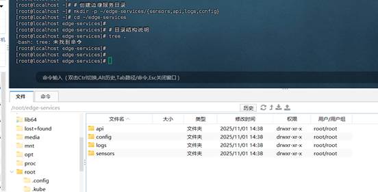 Bash # 创建边缘服务目录 mkdir -p ~/edge-services/{sensors,api,logs,config} cd ~/edge-services # 目录结构说明 tree .
