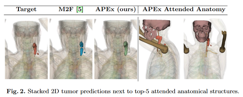 图 2 说明:左侧为堆叠的 2D 肿瘤预测结果,右侧显示在查询混合过程中注意力权重最高的前 5 个解剖结构(例如肝脏、骨骼等),直观体现了模型如何利用相关解剖区域来指导病理预测。