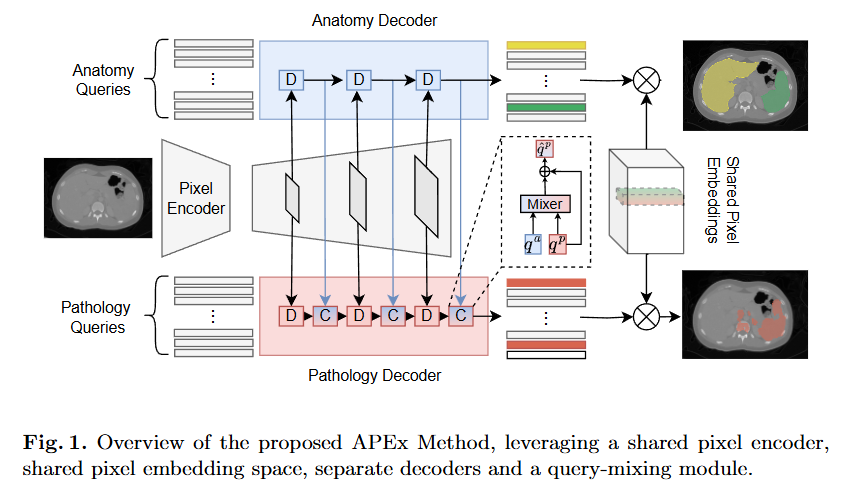 APEx 基于一种基于查询的分割方法,同时利用解剖信息与病理信息。它通过在两个解码器之间交换信息来引入解剖上下文:一个解码器负责分割解剖结构,另一个负责分割病理区域。整体方法如图 1 所示。